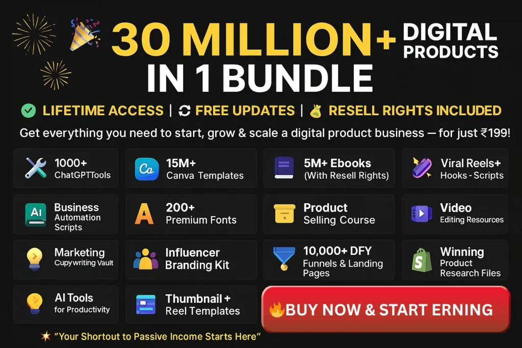 You’ll get lifetime access to 30M+ digital assets including Canva templates, ebooks (with resell rights), ChatGPT tools, business scripts, viral content resources, product research files, landing page templates, and more — all organized and ready to use.
